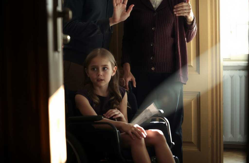 Inside, a slender girl sits in her wheelchair, eyeing them sadly.