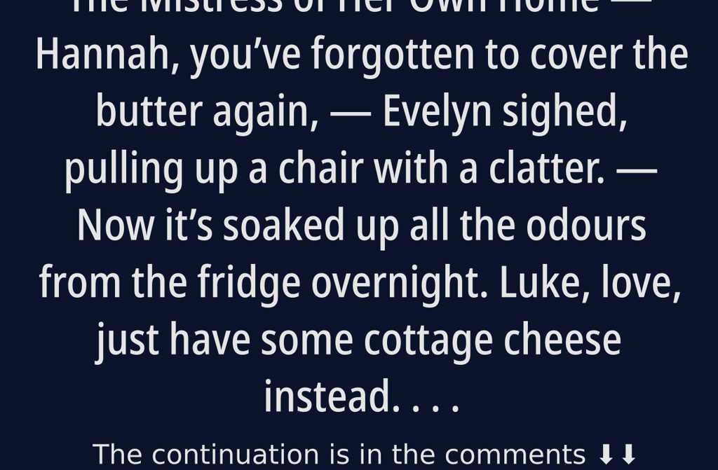 Hannah, youve forgotten to cover the butter again, Evelyn sighed, pulling up a chair with a clatter. Now its soaked up all the odours from the fridge overnight. Luke, love, just have some cottage cheese instead. I bought it fresh yesterday.