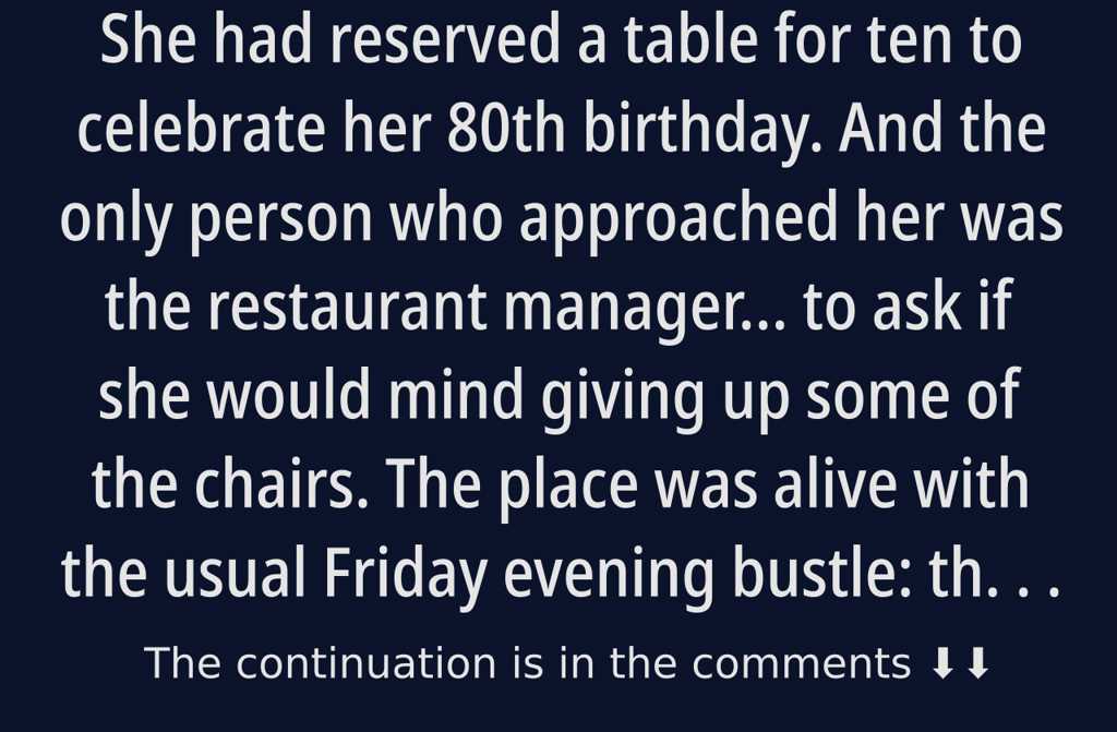 She had reserved a table for ten to celebrate her 80th birthday. And the only person who approached her was the restaurant manager… to ask if she would mind giving up some of the chairs.