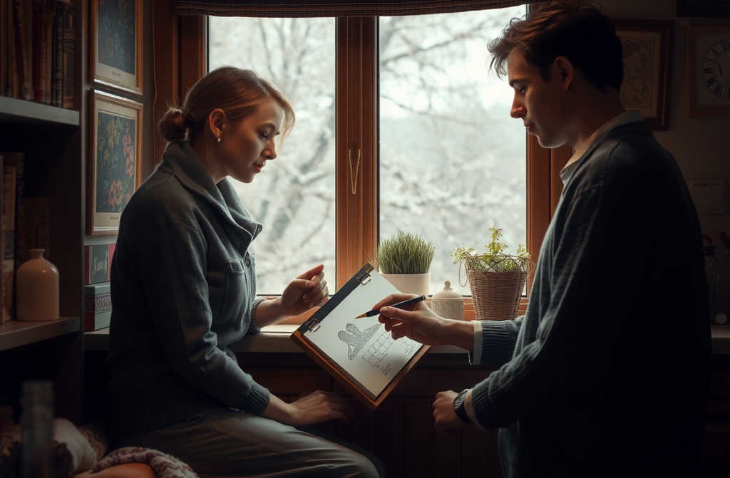 She glanced down at her sketchbook. A drawingkitchen, man with a screwdriver, woman with a mug. Window. Garden outside.