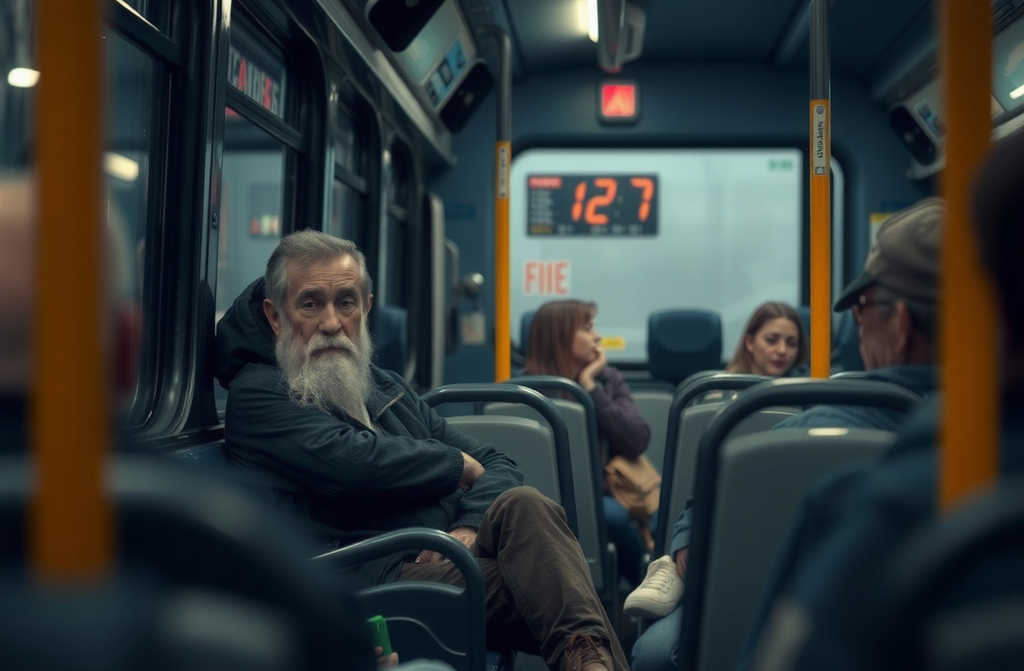 At the next stop, a homeless man climbed aboard. Though probably no older than fifty, life had etched his face with lines and made him look far older. As he shuffled down the aisle, an unmistakably pungent aroma wafted through the bus, causing several stiff upper lips to quiver. His clothes were grubby, his hair in wild disarraya far cry from anyones idea of business casual.