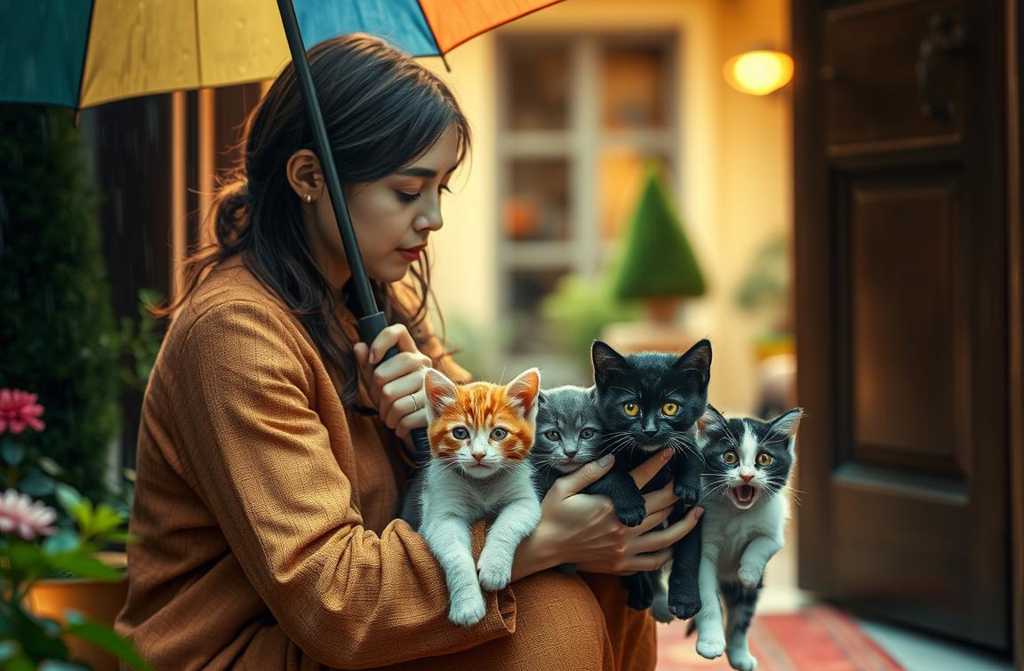 Emily turned the key and went numb: three fluffy guests were perched on the doorstep. The same endless, dreary autumn rain hammered the world, and she stalked through the yard, clutching her umbrella as if it could shield her not only from the cold drops but from the indifferent universe itself. The lock clicked, and a brief, plaintive sound slipped behind her.