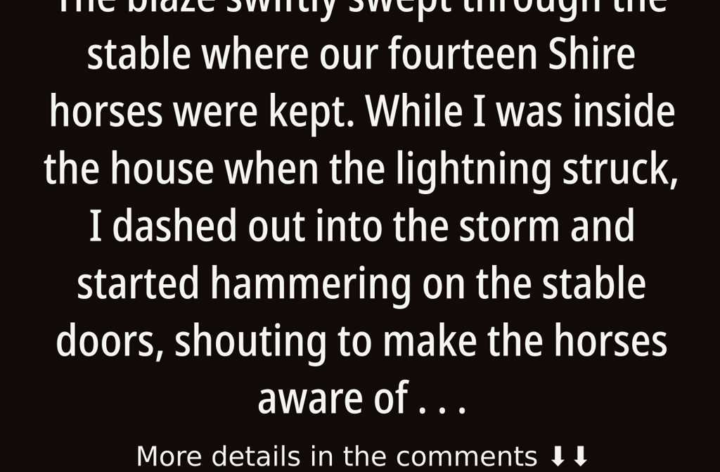 The blaze swiftly swept through the stable where our fourteen Shire horses were kept. While I was inside the house when the lightning struck, I dashed out into the storm and started hammering on the stable doors, shouting to make the horses aware of the danger.
