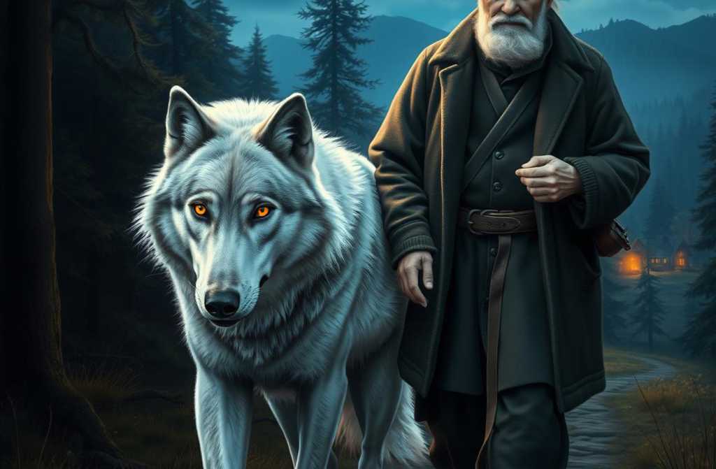 After miles, a glow appeared aheada village. The townsfolk, roused by strange barking, rushed outside and beheld the impossible: a towering wolf gently laying a frail but living man at their doorstep.