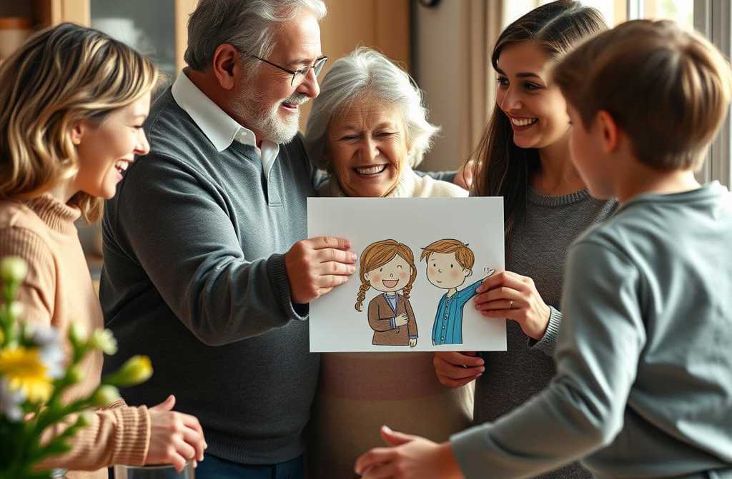 I love it. And youve drawn everyone just right! Paul, come and see what your granddaughter made us. Ill put this in a frame, itll make me smile every time I look at it. What a lovely big family we have!