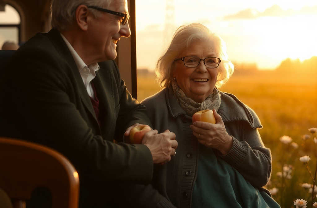 On the way home, he bumped into the same lady from earlier. They shared apples and laughed about the hard graft they were both doing at their allotments. She encouraged him, saying he still had plenty of life ahead and reminding him that tending his patch could be a real source of happiness and purpose. As he got off at his stop, Rob smiled up at the setting sun, feeling content and no longer held back by sadness.