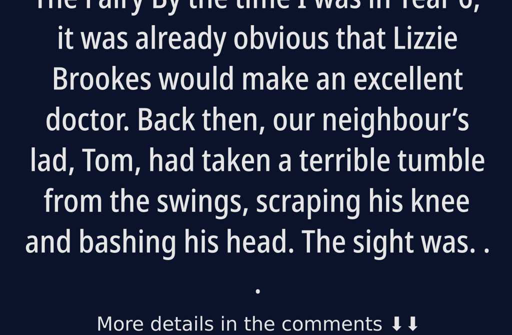 Emma, fetch some water, bandages, and a bottle of TCP! she ordered her best mate, who lived just across the green from the playground. Without a word, Emma dashed off to do as Lizzie asked.