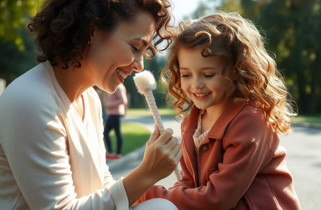 Give it, Mum! My turn! With a giggle, she grabbed the wand from her mum and waved it.