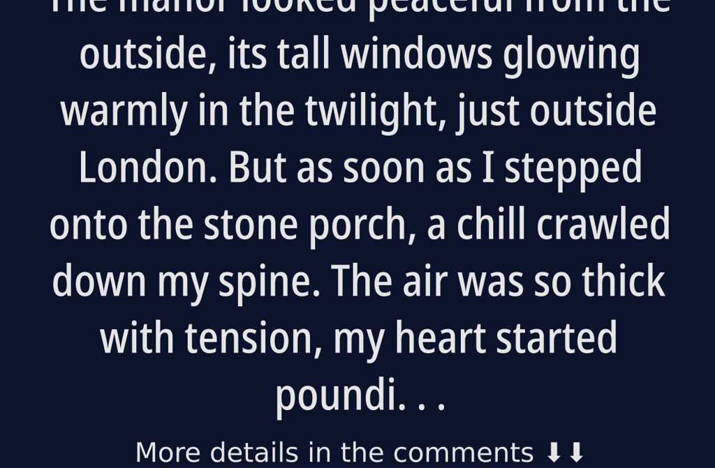 The manor looked peaceful from the outside, its tall windows glowing warmly in the twilight, just outside London. But as soon as I stepped onto the stone porch, a chill crawled down my spine. The air was so thick with tension, my heart started pounding. Every instinct screamed I was walking straight into a storm.