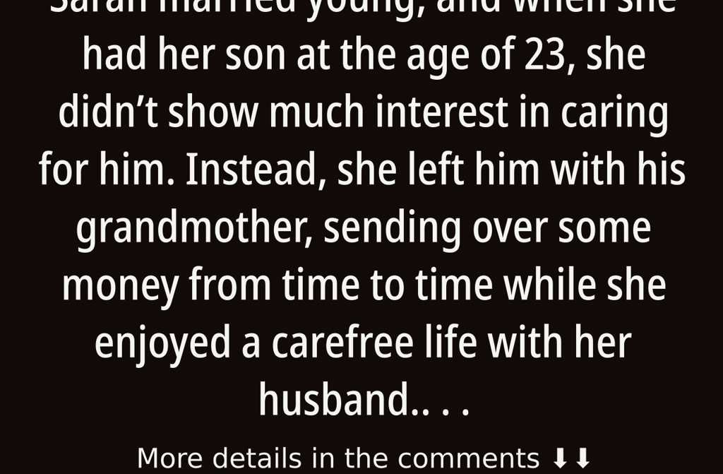 Sarah married young, and when she had her son at the age of 23, she didnt show much interest in caring for him. Instead, she left him with his grandmother, sending over some money from time to time while she enjoyed a carefree life with her husband. Two years later, circumstances forced them to bring their son home, but Sarah didnt acknowledge him as her own and kept her distance. She enrolled him in nursery to limit their contact, and later sent him to primary school, where he was teased and struggled academically.