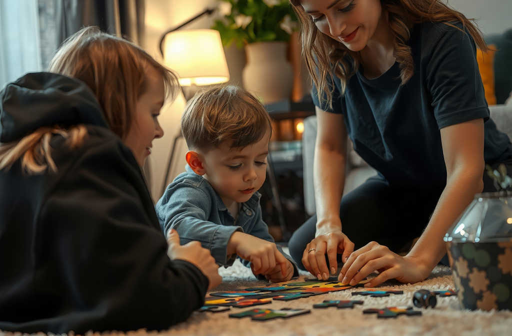 One evening, Rachel arrived at her parents for Nathan. He sat on the carpet, frowning in concentration as he built a puzzle. When he spotted his mum, he leapt up and tugged her over.