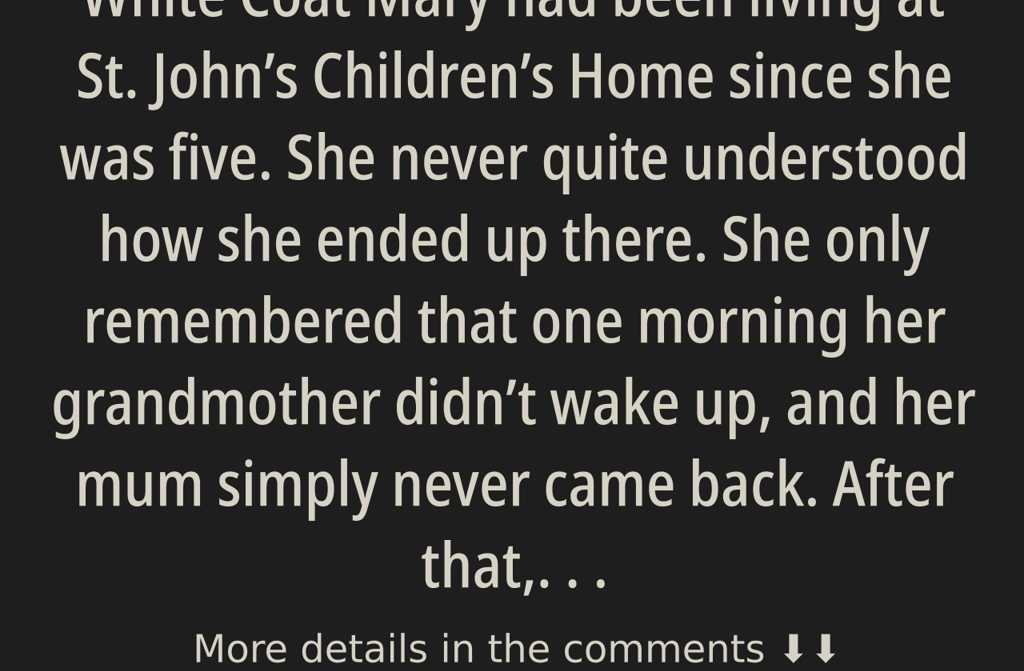 Mary had been living at St. Johns Childrens Home since she was five. She never quite understood how she ended up there. She only remembered that one morning her grandmother didnt wake up, and her mum simply never came back. After that, it was strange hands, painted corridors, and the ever-present smell of boiled cabbage, which seemed destined to stay with her forever. At first, she used to cry at night, but eventually the tears stopped, and she simply got on with things: quietly, diligently, as if hoping that her effort would somehow earn her something real.