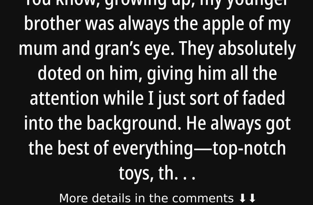 You know, growing up, my younger brother was always the apple of my mum and grans eye. They absolutely doted on him, giving him all the attention while I just sort of faded into the background. He always got the best of everythingtop-notch toys, the nicest sweets, delicious pies, berries, you name it. Meanwhile, I was more or less forgotten, made to tidy up after him, fix his bed, and prepare his breakfast every morning. Honestly, I was pretty upset, feeling like I was just his personal maid, always rushing around to meet his every demand.