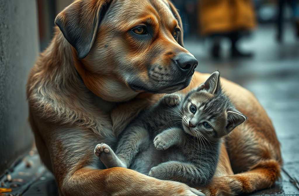 Sometimes the dog wrapped his paws around his kitten, shielding it from the cold and wet. He shivered, but still licked the little one clean. Keeping it warm and fed was all that mattered.