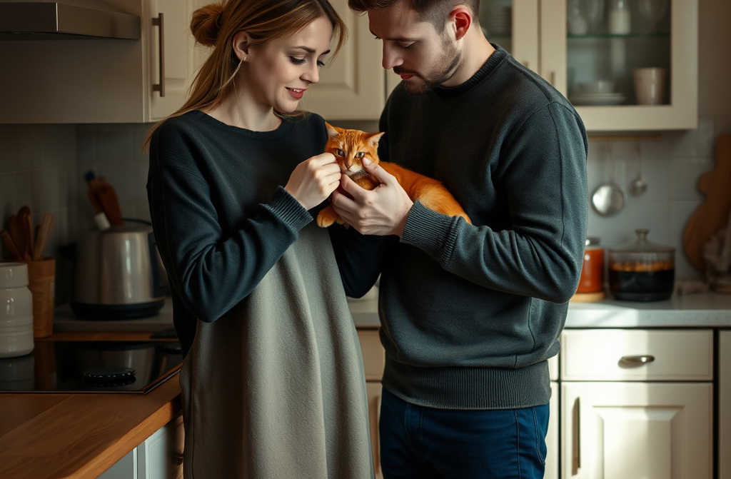 Emma darts away. Morris is found wedged under the bed, huddled in the corner with wide eyes and dishevelled fur. When Emma reaches to pull him out, he hisses and flattens his ears.