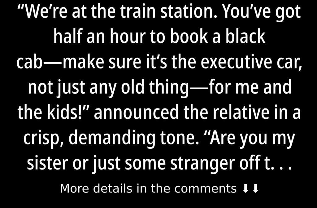 Were at the train station. Youve got half an hour to book a black cabmake sure its the executive car, not just any old thingfor me and the kids! announced the relative in a crisp, demanding tone.