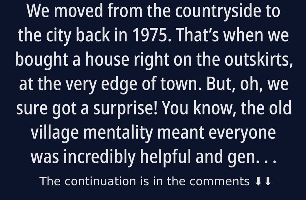 We moved from the countryside to the city back in 1975. Thats when we bought a house right on the outskirts, at the very edge of town. But, oh, we sure got a surprise! You know, the old village mentality meant everyone was incredibly helpful and generous, and my parents were no exception. So, when the former owners asked if they could stay on for a few weeks while they sorted out some paperwork, my parents kindly agreed.