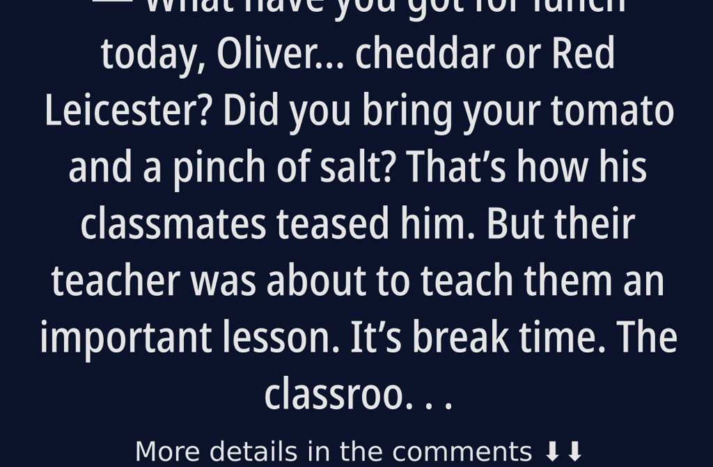 What have you got for lunch today, Oliver cheddar or Red Leicester? Did you bring your tomato and a pinch of salt? Thats how his classmates teased him.