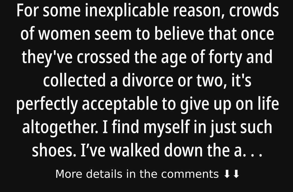 For some inexplicable reason, crowds of women seem to believe that once they’ve crossed the age of forty and collected a divorce or two, it’s perfectly acceptable to give up on life altogether. I find myself in just such shoes. Ive walked down the aisle twice. The first time, when I was fresh-faced and hopeful, and from that chapter I have a wonderful daughter. The second time, I was thirty. Neither marriage lasted more than a pair of years. There seemed to be something a bit off-centre about the men.