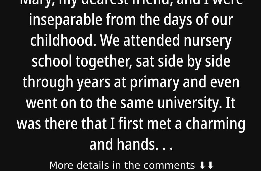 Mary, my dearest friend, and I were inseparable from the days of our childhood. We attended nursery school together, sat side by side through years at primary and even went on to the same university. It was there that I first met a charming and handsome young man, whose presence made my heart flutter with affection. Yet, fate unfolded differently than I had hoped. Quite by accident, he happened to notice Marywho was not only lovely but possessed a truly enchanting sort of graceand it was she who won his heart.