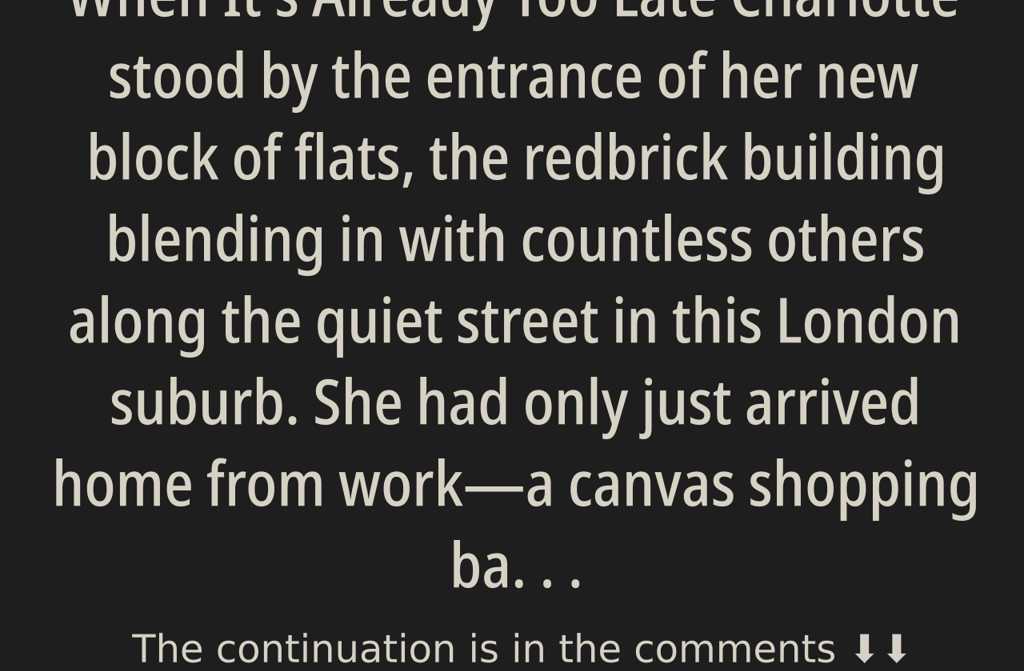 Charlotte stood by the entrance of her new block of flats, the redbrick building blending in with countless others along the quiet street in this London suburb. She had only just arrived home from worka canvas shopping bag dug uncomfortably into her palm, a reminder of the simple domestic comfort shed been seeking so fiercely as of late.
