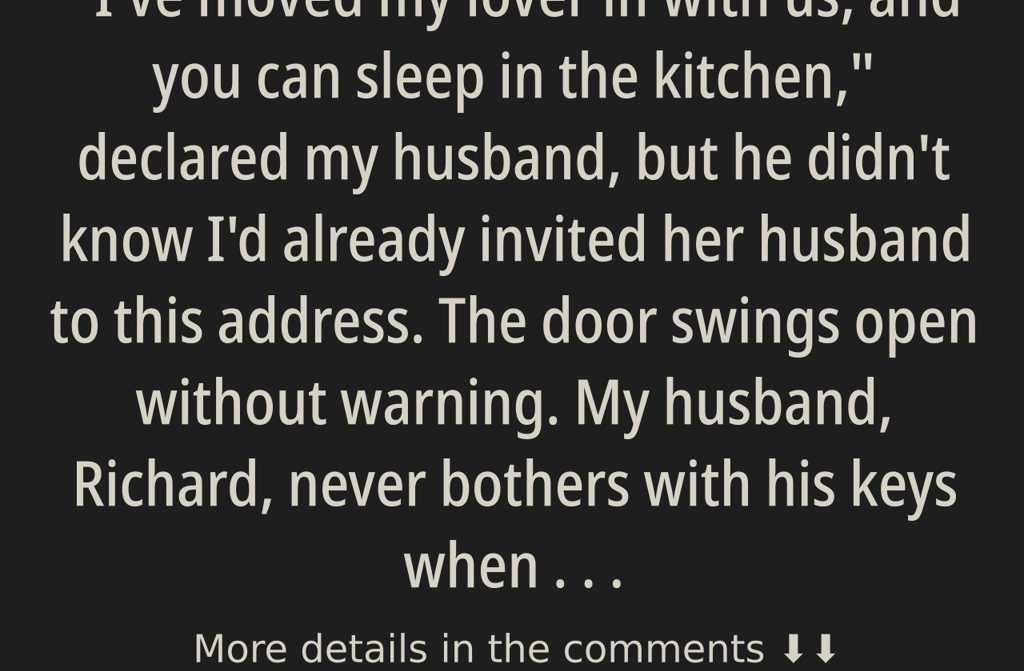 “Ive moved my lover in with us, and you can sleep in the kitchen,” he announces. But he has no idea Ive already called her husband to our home.