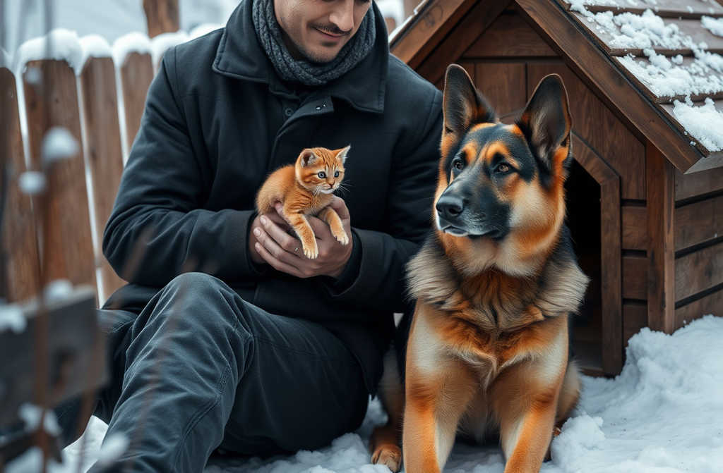 Winter had blanketed Andrew’s garden in a soft layer of snow, but his loyal dog Duke, a giant German Shepherd, was behaving strangely. Instead of curling up in the spacious kennel Andrew had lovingly built for him last summer, Duke stubbornly insisted on sleeping outside, right on the snow. Watching from his window, Andrew felt a pang in his chest—Duke had never acted like this before. Each morning, when Andrew went out to him, Duke fixed him with a tense stare. Every time Andrew neared the kennel, the dog wedged himself between Andrew and the entrance, growling softly and gazing at him pleadingly, as if to say, “Please, don’t go in there.” This behaviour—so out of character after years of close friendship—left Andrew unsettled. What was his best friend hiding? Determined to get to the bottom of things, Andrew came up with a plan—he lured Duke into the kitchen with a tempting steak. While the big dog, locked indoors, barked at the window in protest, Andrew carefully approached the kennel and crouched down to take a look inside. His heart skipped a beat as his eyes adjusted to the darkness and he saw something that chilled him to the bone… …Inside, huddled in a blanket, was a tiny kitten—dirty, frozen, and barely breathing. Its eyes opened with difficulty, and its little body trembled from the cold. Duke must have found it somewhere—and instead of chasing it off or leaving it to fend for itself, he had taken it in. He’d slept outside so as not to frighten the kitten, guarding the entrance as though the kennel sheltered a precious treasure. Andrew held his breath. He reached in gently and gathered the little creature to his chest. At that moment, Duke rushed over and pressed himself by Andrew’s shoulder—no longer growling, just quietly, ready to help. “You’re a good dog, Duke…” Andrew whispered, holding the kitten tight. “Better than many people I know.” From that day on, there weren’t just two friends living in the garden, but three. And the kennel, lovingly built, regained its purpose—as a tiny house for rescued souls.