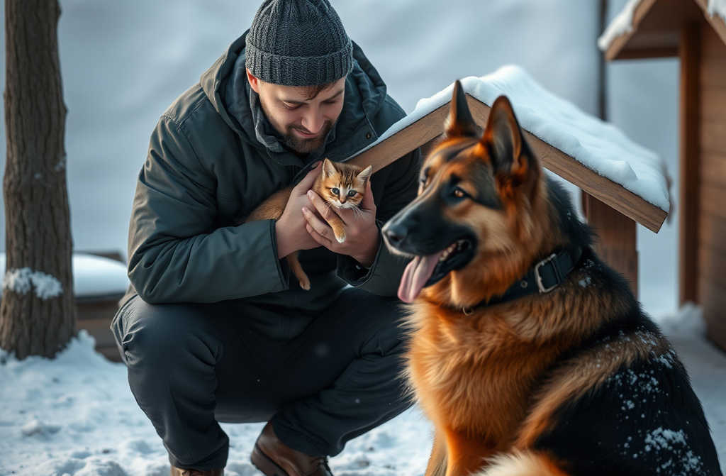 Winter had blanketed Andrew’s garden with soft snow, but his loyal dog Duke, a massive German Shepherd, was acting strangely. Instead of curling up in the large kennel Andrew had lovingly built for him last summer, Duke stubbornly insisted on sleeping outside, right in the snow. Watching from his window, Andrew felt a pang of worry—Duke had never behaved like this before. Each morning, as he stepped outside, Andrew noticed Duke watching him tensely. Whenever he approached the kennel, Duke positioned himself between Andrew and the entrance, growling softly and looking at him pleadingly, as if to say: “Please, don’t go in there.” This odd behaviour was so out of character for their years of friendship, it made Andrew uneasy—what was his best friend hiding? Determined to get to the bottom of it, Andrew came up with a plan—he lured Duke into the kitchen with a tempting piece of steak. While the dog, locked inside, barked desperately at the window, Andrew crept towards the kennel and crouched down to peer inside. His heart skipped a beat as his eyes adjusted to the darkness and he saw something that froze him on the spot… …There, curled up in a blanket, was a tiny kitten—dirty, freezing, and barely breathing. Its eyes barely opened, and its frail body shivered with cold. Duke had found it somewhere, and instead of chasing it away or leaving it to its fate, he had sheltered it. He had slept outside to avoid scaring it and guarded the entrance as if there was treasure inside. Andrew held his breath. He reached out, gently lifted the tiny creature and pressed it to his chest. In that moment, Duke raced over and nestled beside his shoulder—not growling, but gently, eager to help. “You’re a good dog, Duke…” Andrew whispered, clutching the kitten. “Better than most people.” From that day on, there were no longer just two friends living in the garden, but three. And the lovingly built kennel found its purpose again—as a little home for souls in need of saving.