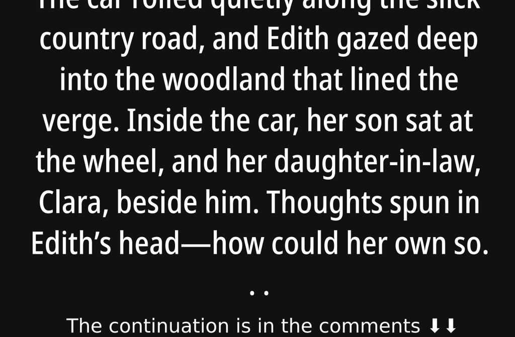 The car rolled quietly along the slick country road, and Edith gazed deep into the woodland that lined the verge....